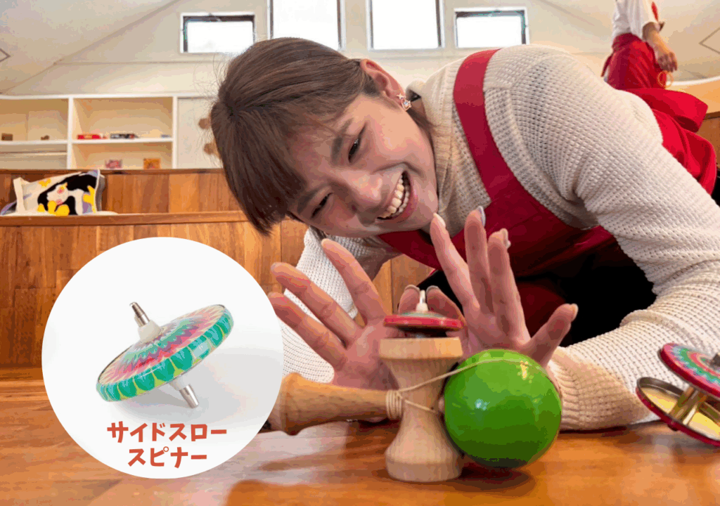 あそび選手権でプレゼンした「サイドスロースピナー」で一緒に遊びました。最初は皆さん苦戦している様子でしたが、コツを伝えたら上手に回せるようになりましたよ!