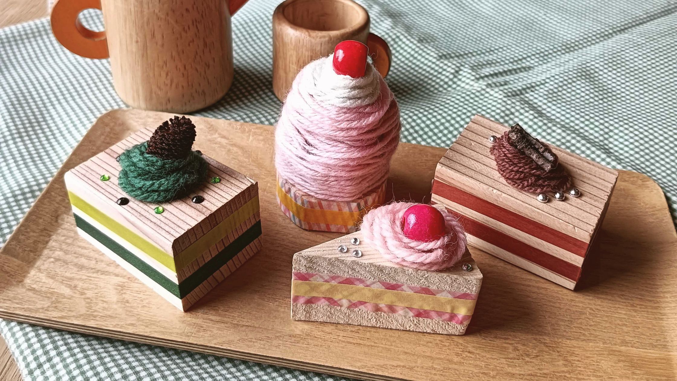 杉の端材にマスキングテープや毛糸・ビーズ・シールなどでデコレーションしてオリジナルケーキをつくろう!
