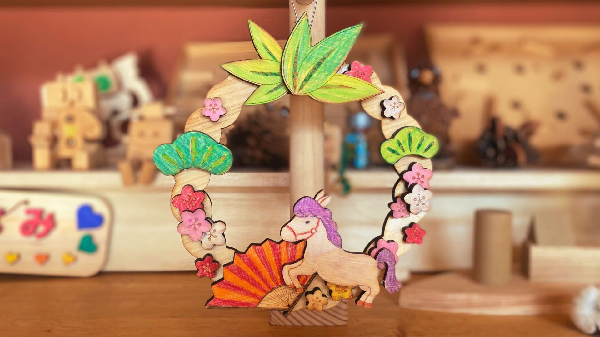 正月にちなんだ木のパーツを貼りあわせ、