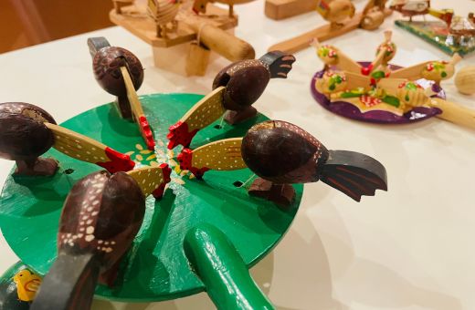 独楽(コマ)や各地の郷土玩具、組み木細工を遊びながら体験できる小屋が並びます。昔から歌い継がれた「わらべうた」や江戸中期から伝わる「投扇興」、お茶室「四谷庵」でのお茶会など、おもちゃ学芸員イベントも多数開催。日本の遊び文化の継承を行っています。