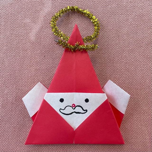 折り紙でサンタさんを折ります。手紙も書いて、クリスマスツリーに飾るオーナメントにしましょう。