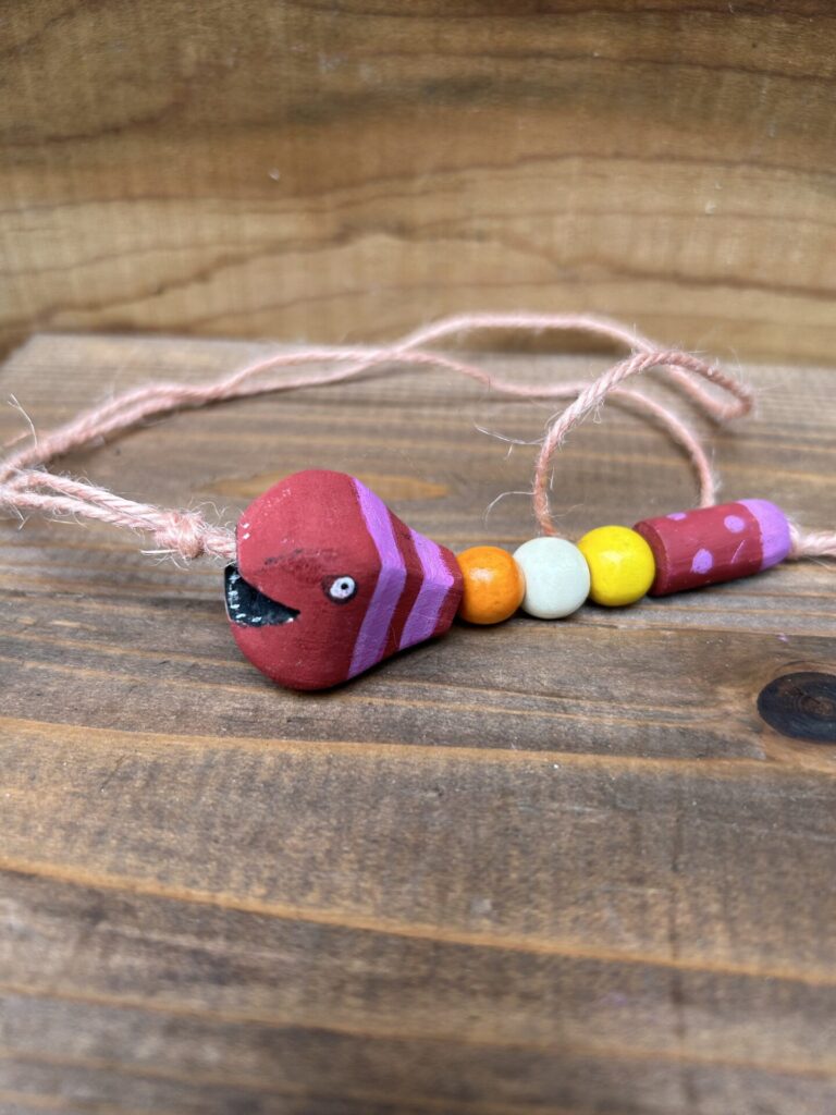 木のヘビと木のビーズを繋げてネックレスを作ります。顔は自分らしく仕上げます。