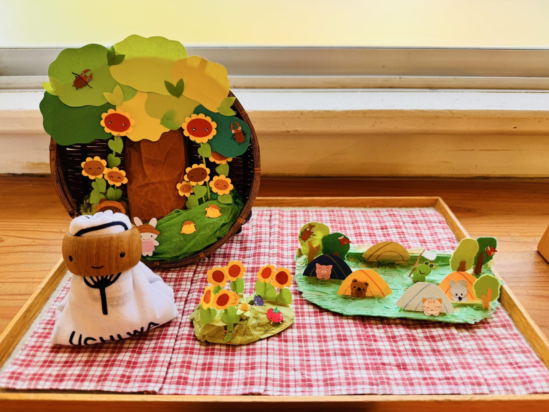 今は、木のおもちゃの「リングドール」と動物たちがたくさんのひまわりに見守られながら楽しい夏を過ごしている様子が表現されています。
