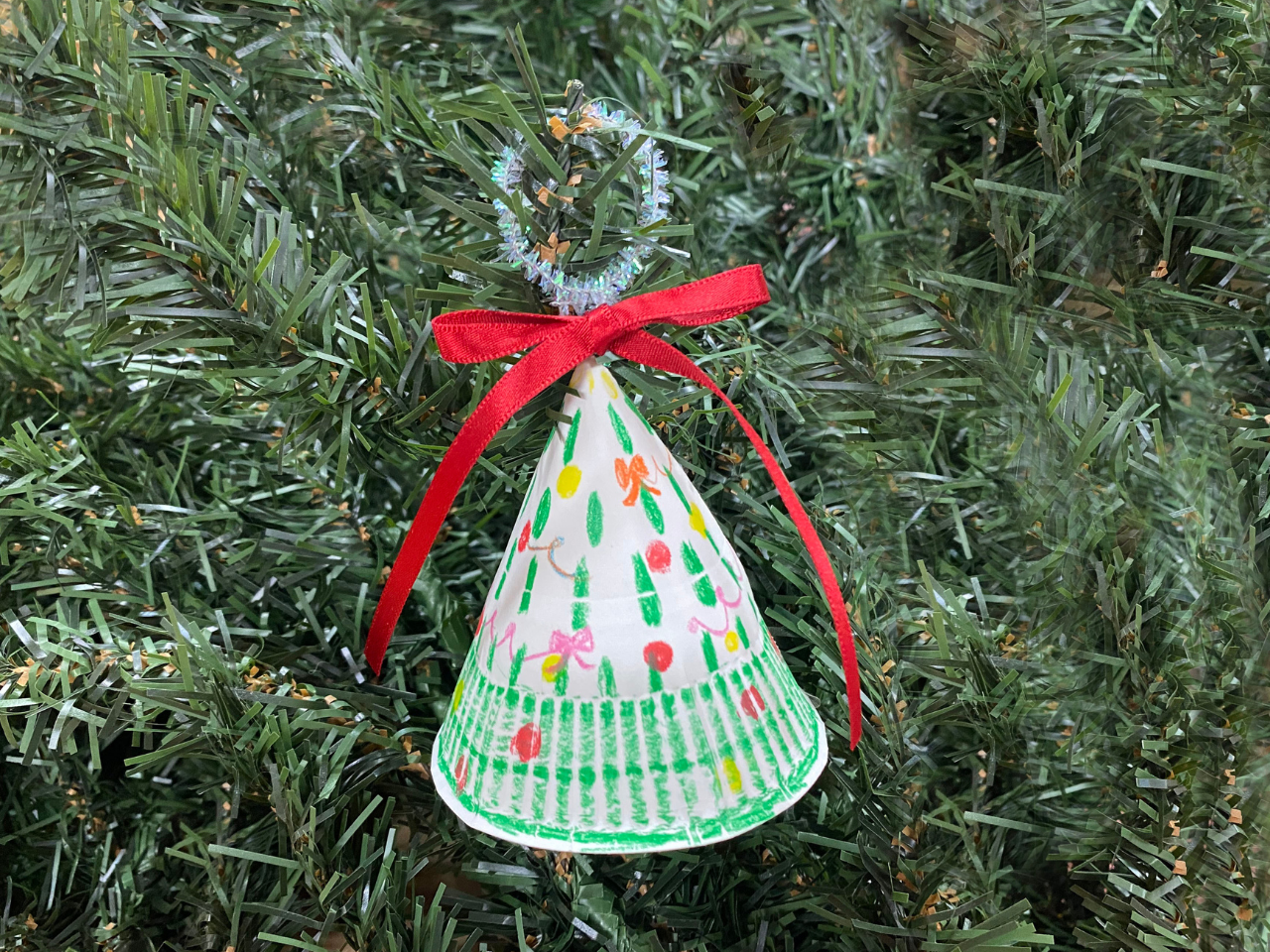紙皿をツリーや帽子に見立てて、リンリンと音の鳴るクリスマスベルをつくります。