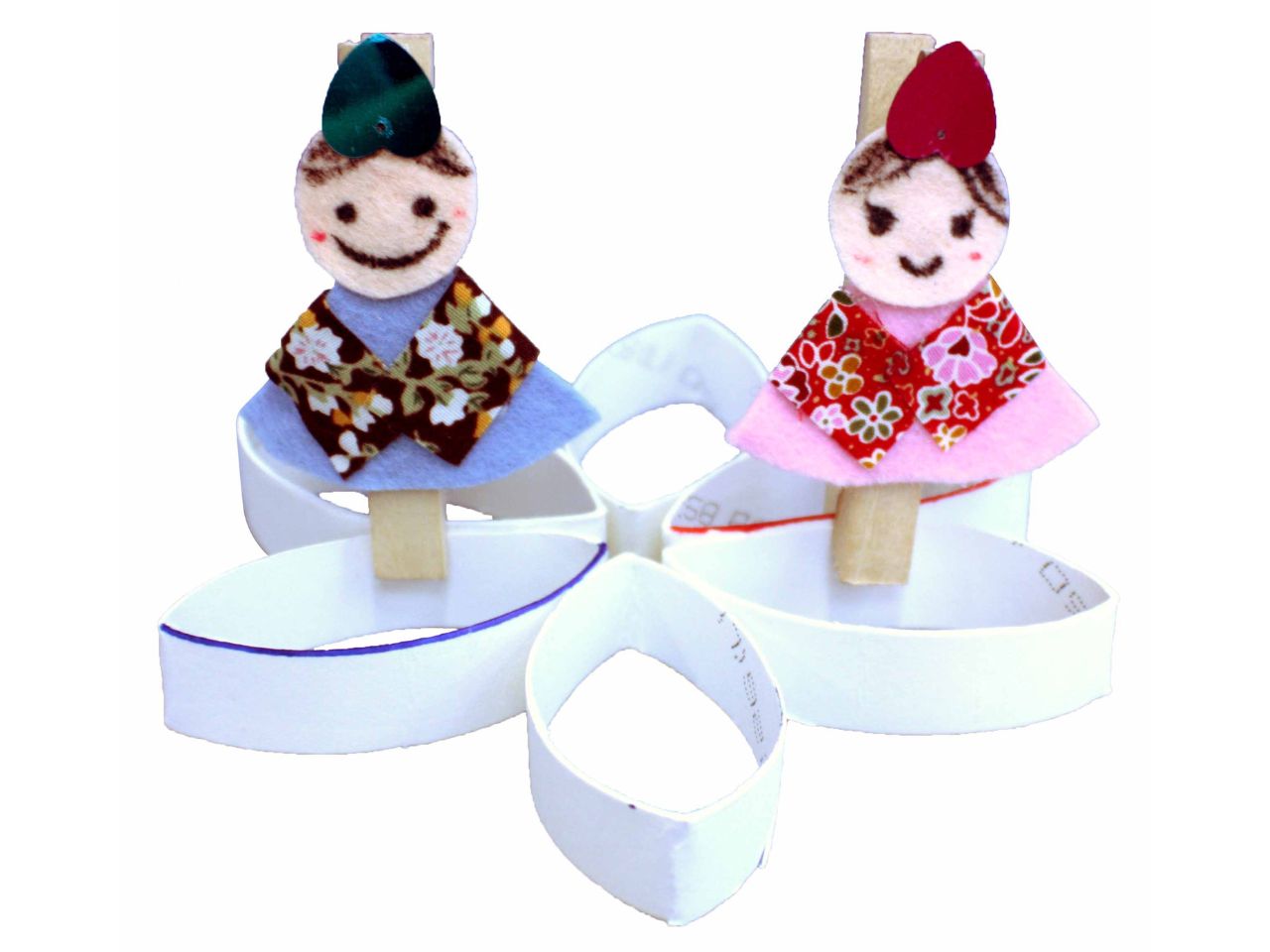 木のピンチで作ったおひなさまが花のモチーフを行ったり来たり。