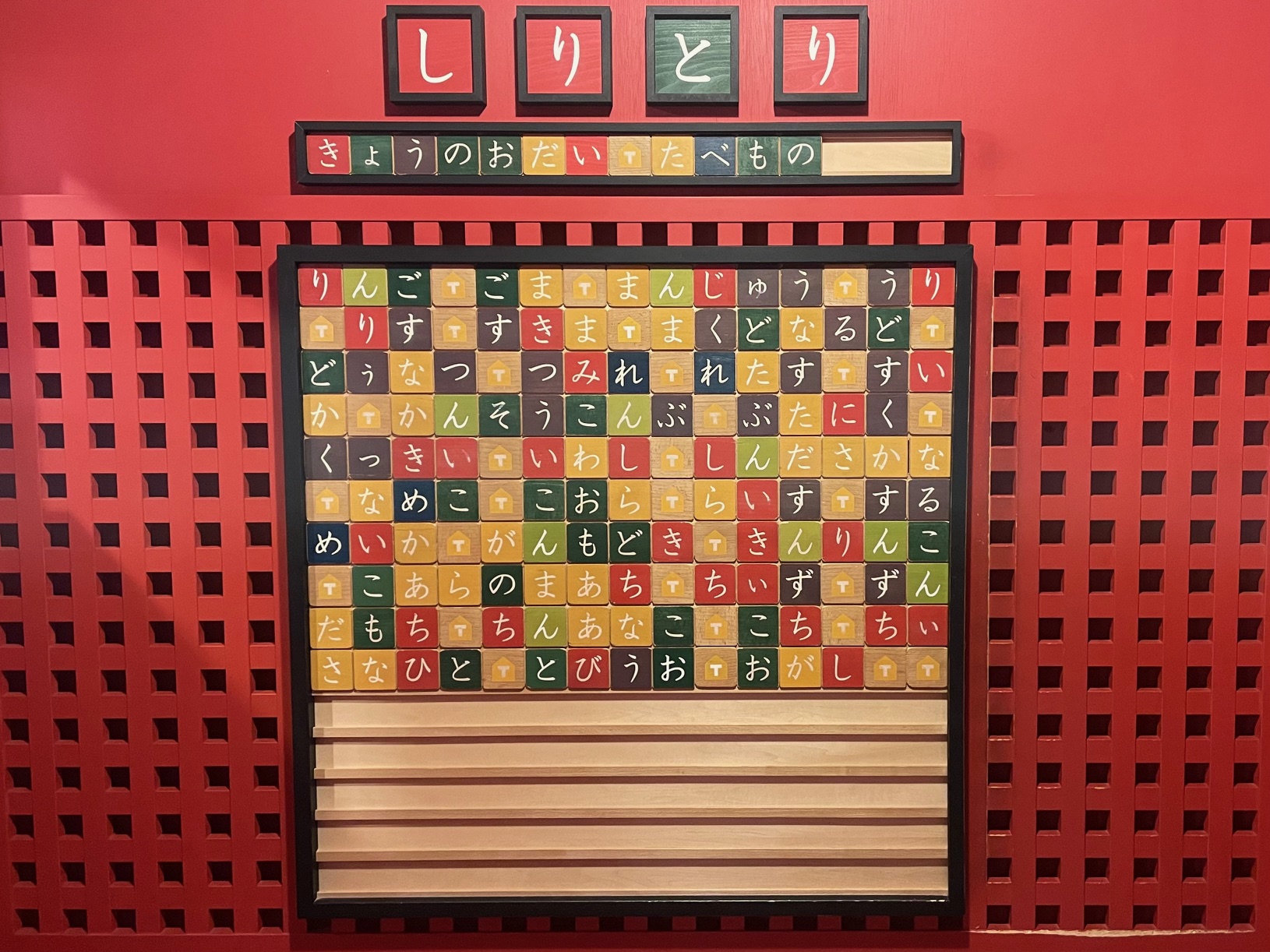 2/22 しりとりで言葉がたくさんつながりましたおもちゃのまちあかにある「しりとりのこや」、沢山の言葉が並びました。