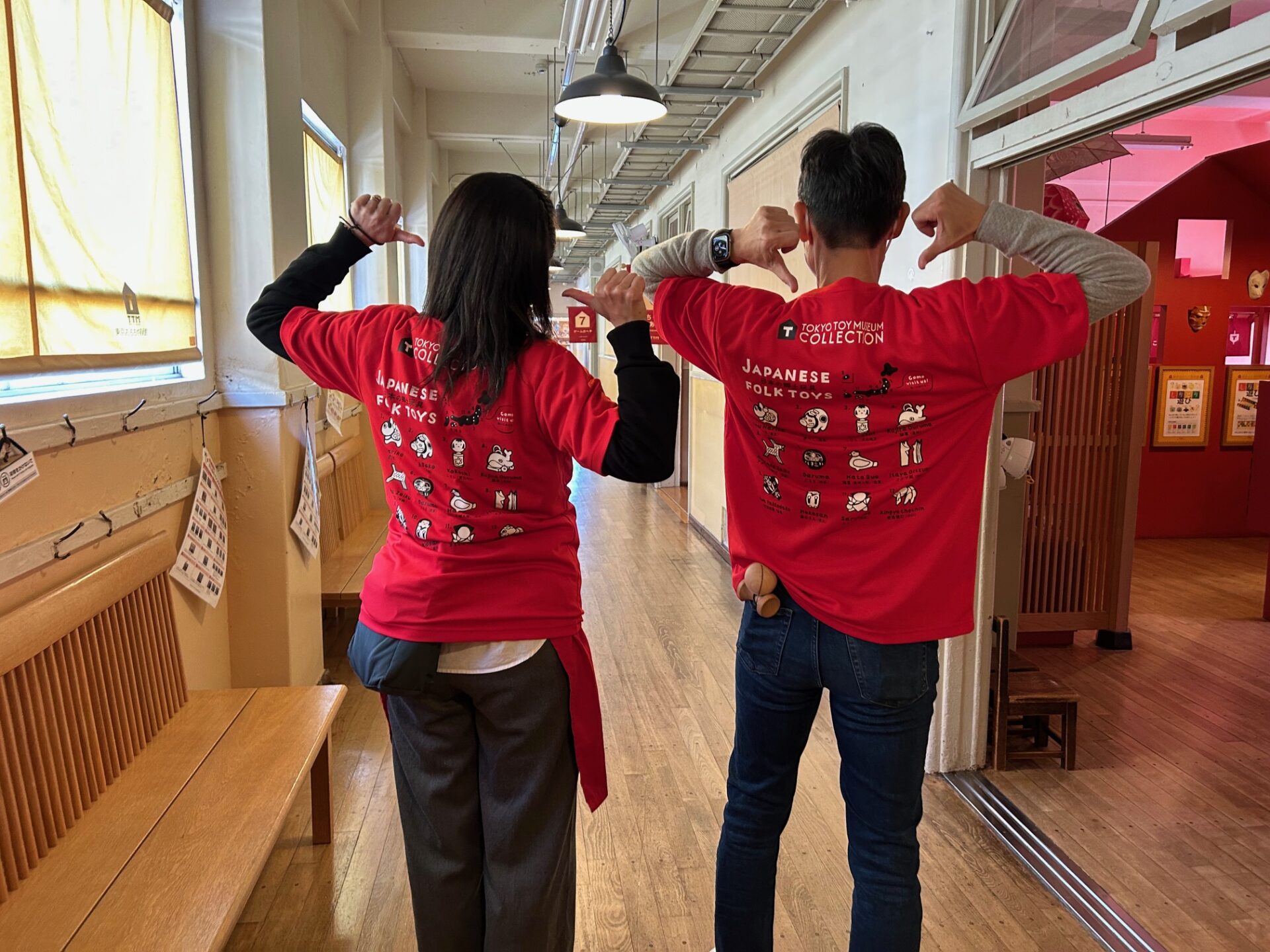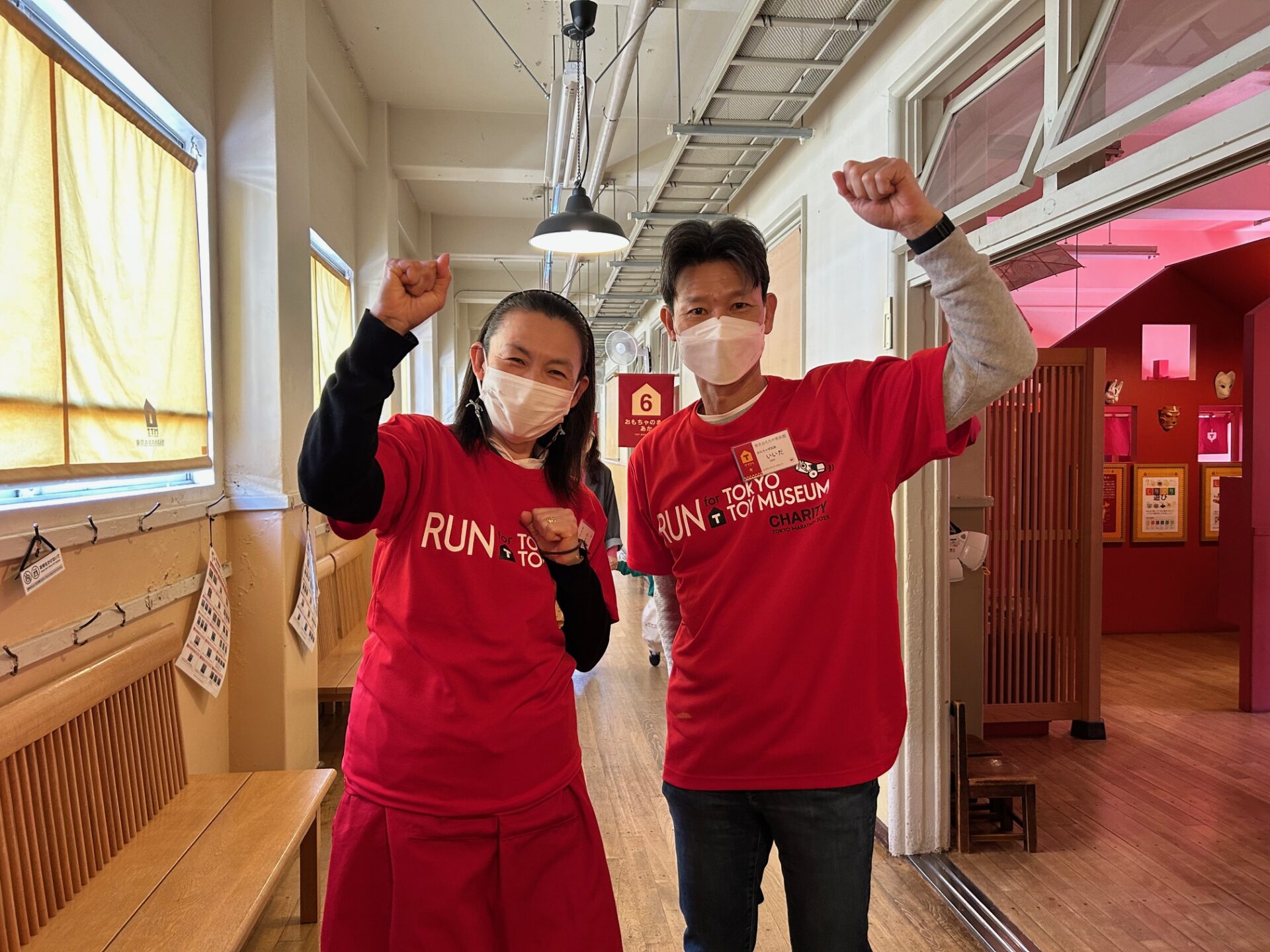 明日はいよいよ東京マラソン!ということで館内でもおもちゃ学芸員(ボランティアスタッフ)が東京おもちゃ美術館オリジナルの応援Tシャツを着て活動しています。