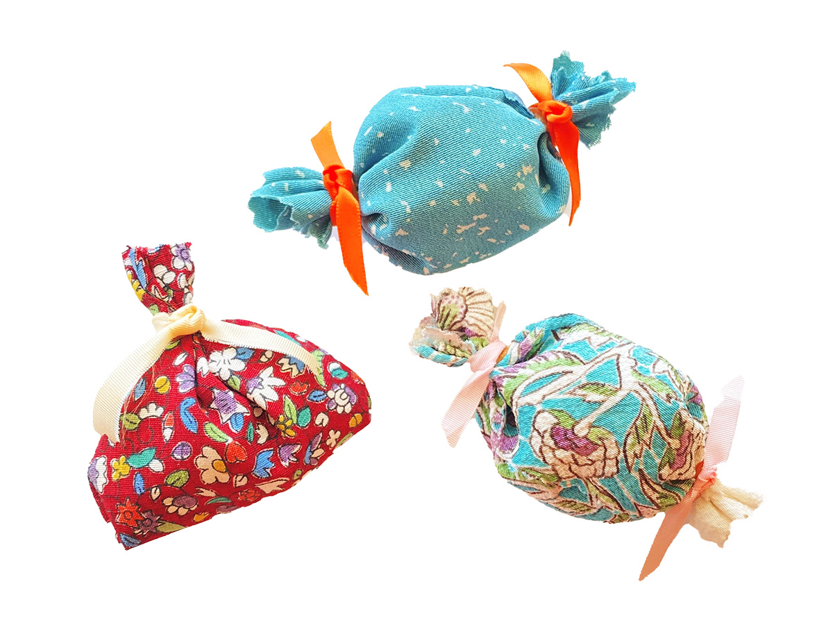 新宿で染めた絹の江戸更紗や江戸小紋の着物生地を使って、針を使わないお手玉を作ろう!