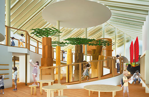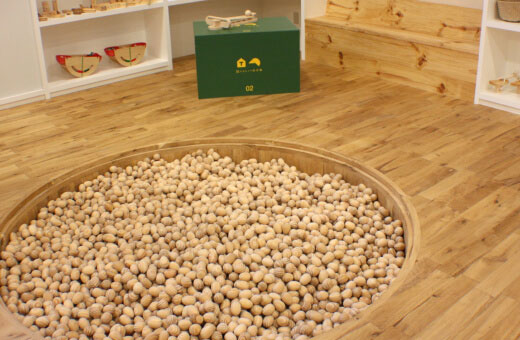 0~2歳と保護者のみが入室できる木のぬくもりたっぷりの木育(モクイク)ひろば。リュウキュウマツ(蔡温松)で作られたヤンバルクイナのたまごプールは、赤ちゃんも大人も一緒に楽しめます。