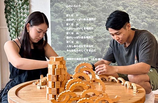首里城再建時の端材で作られた積み木や、リュウキュウマツで作られた沖縄ならではのゴーヤーチャンプルーを模した積み木で遊べます。