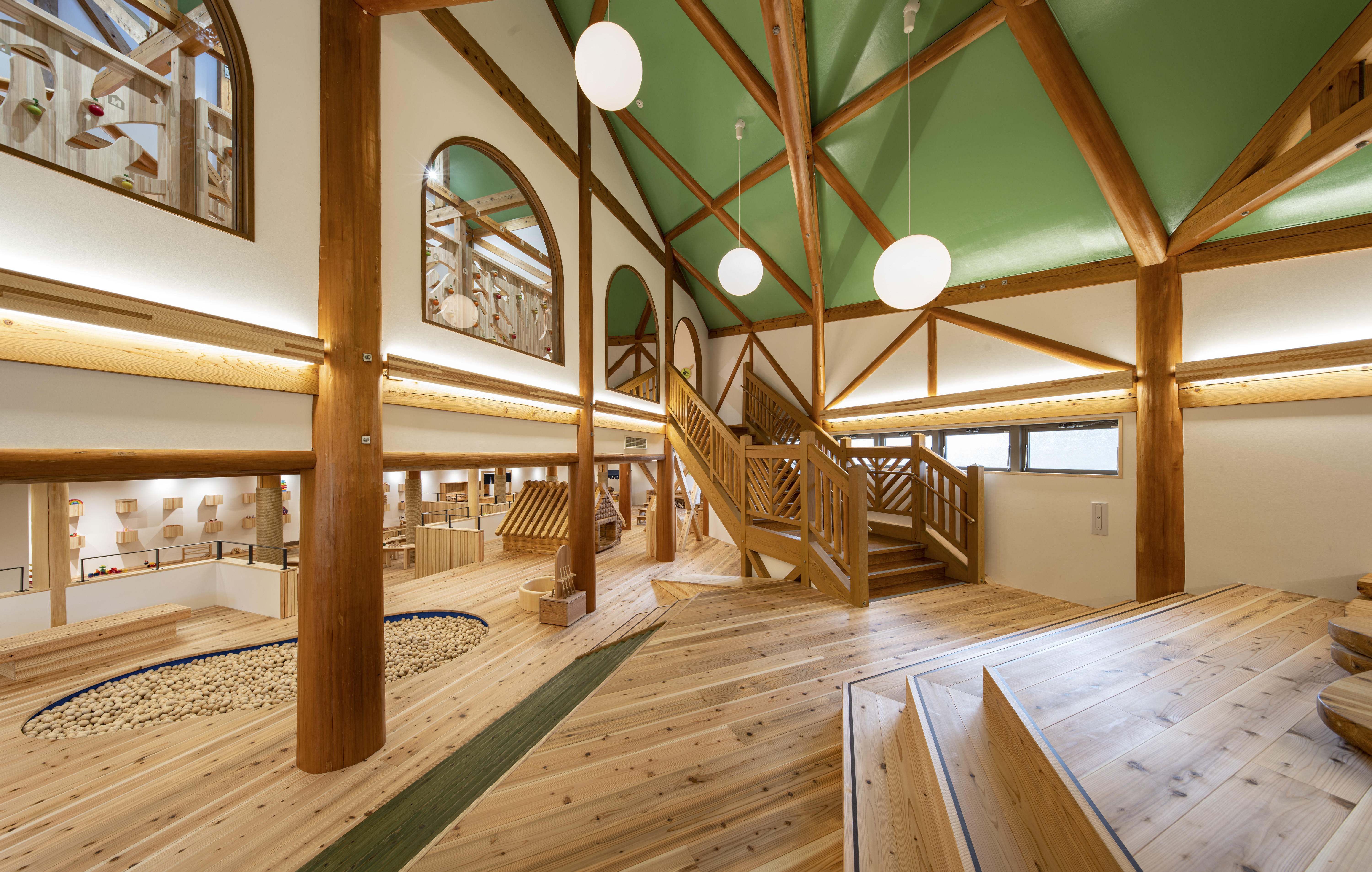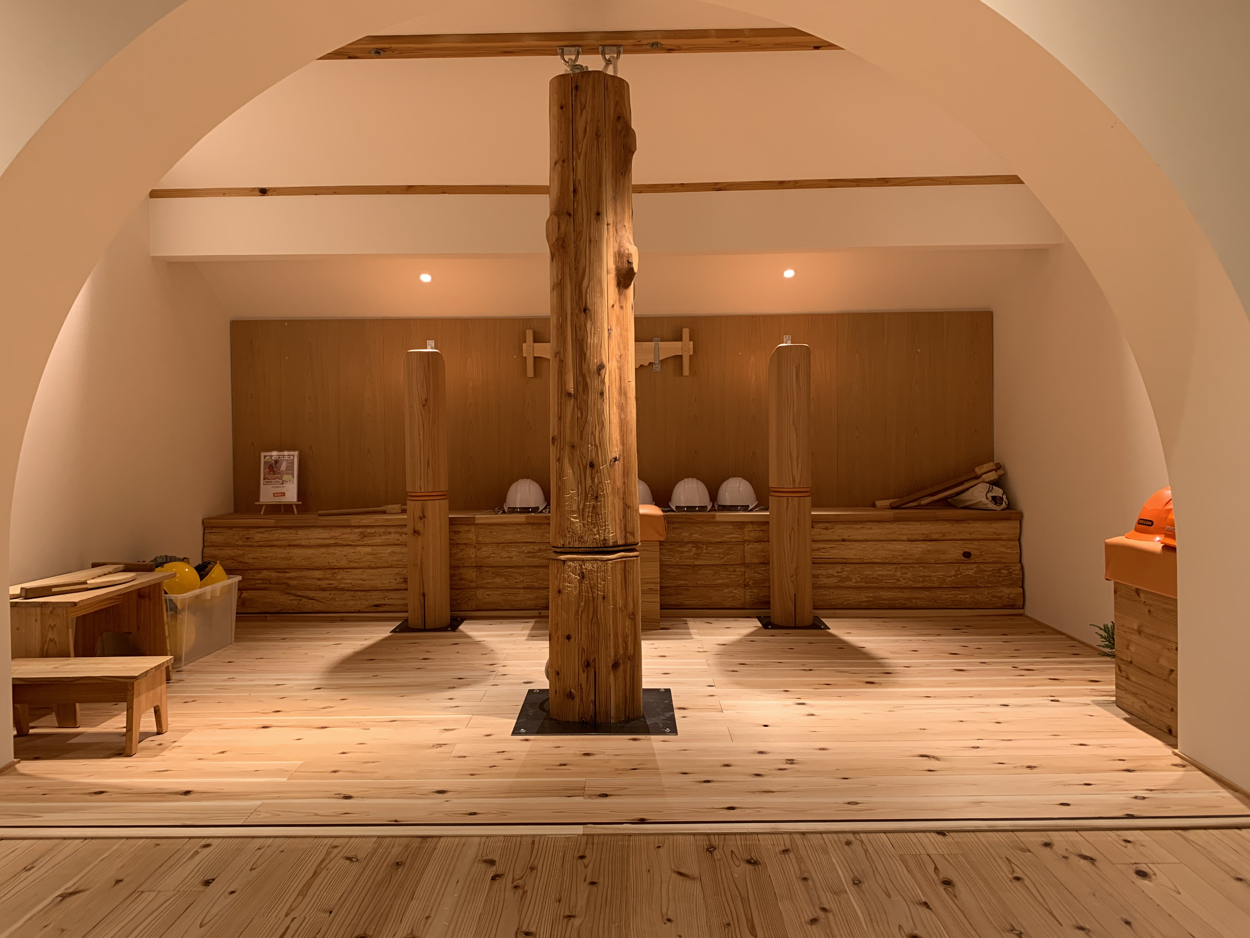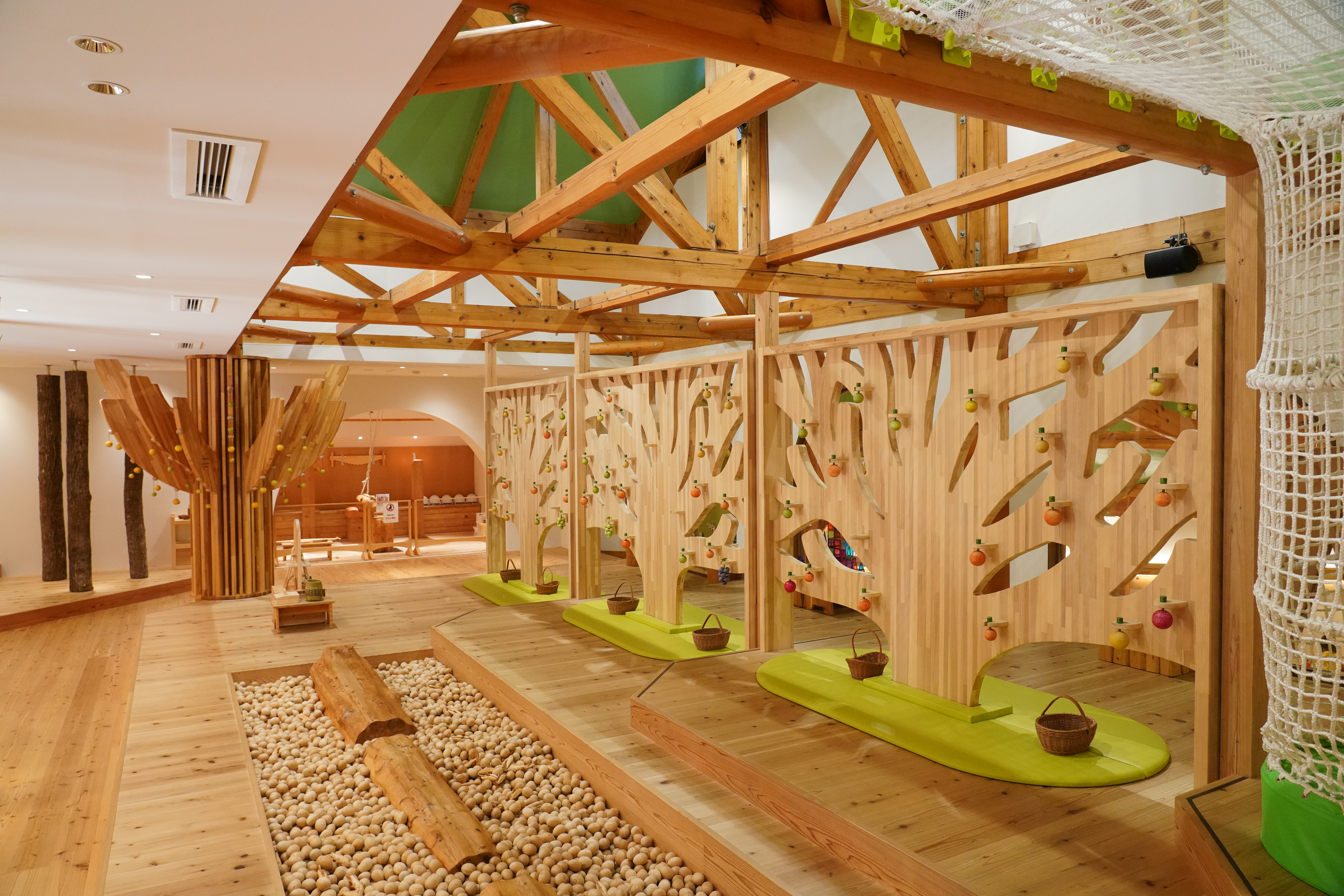 那賀町産の木材を随所に使用した館内は、山の地形を再現するように1階から2階へと続きます。1階には川口ダム湖を模した「木のたまごの湖」や、山菜収穫あそびなどができる「しゅうかくのやま」があり、2階には伐倒などの林業体験ができる「りんぎょうひろば」や柚子のシンボルツリーなど、那賀町の魅力を感じられる空間が広がっています。