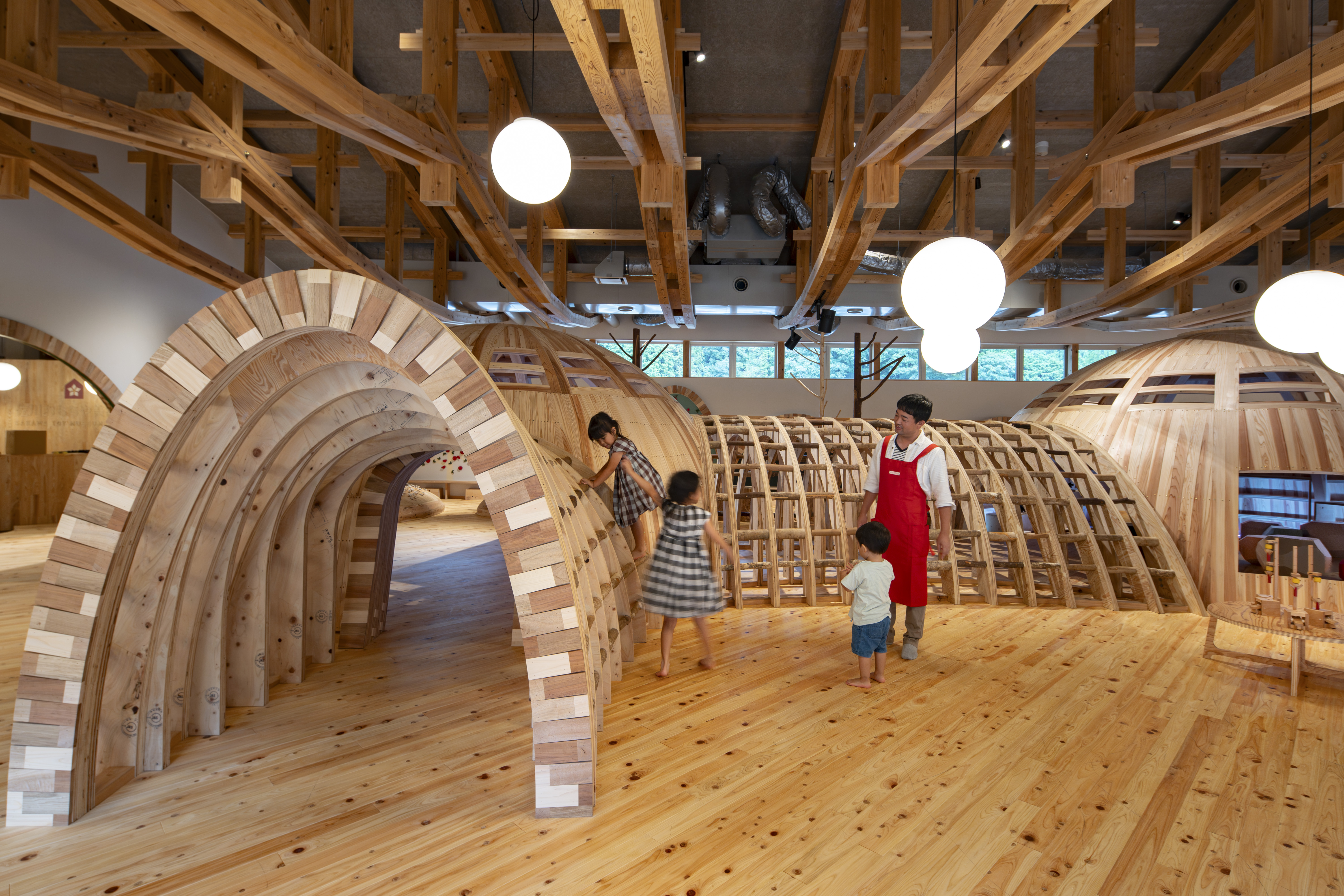 館内は、ヒノキやスギの他、ヤマザクラやクリ、ネズミモチ、ヤブツバキなどの広葉樹を含む多様な高知県産材がふんだんに活用されています。また、釘を使わずに細い木の桟を幾何学的な文様に組み付ける伝統木工技法「組子(くみこ)」を取り入れた階段や、野山を表現した木造トンネルなど、自然の豊かさと受け継がれてきた伝統を感じる木育空間が広がります。