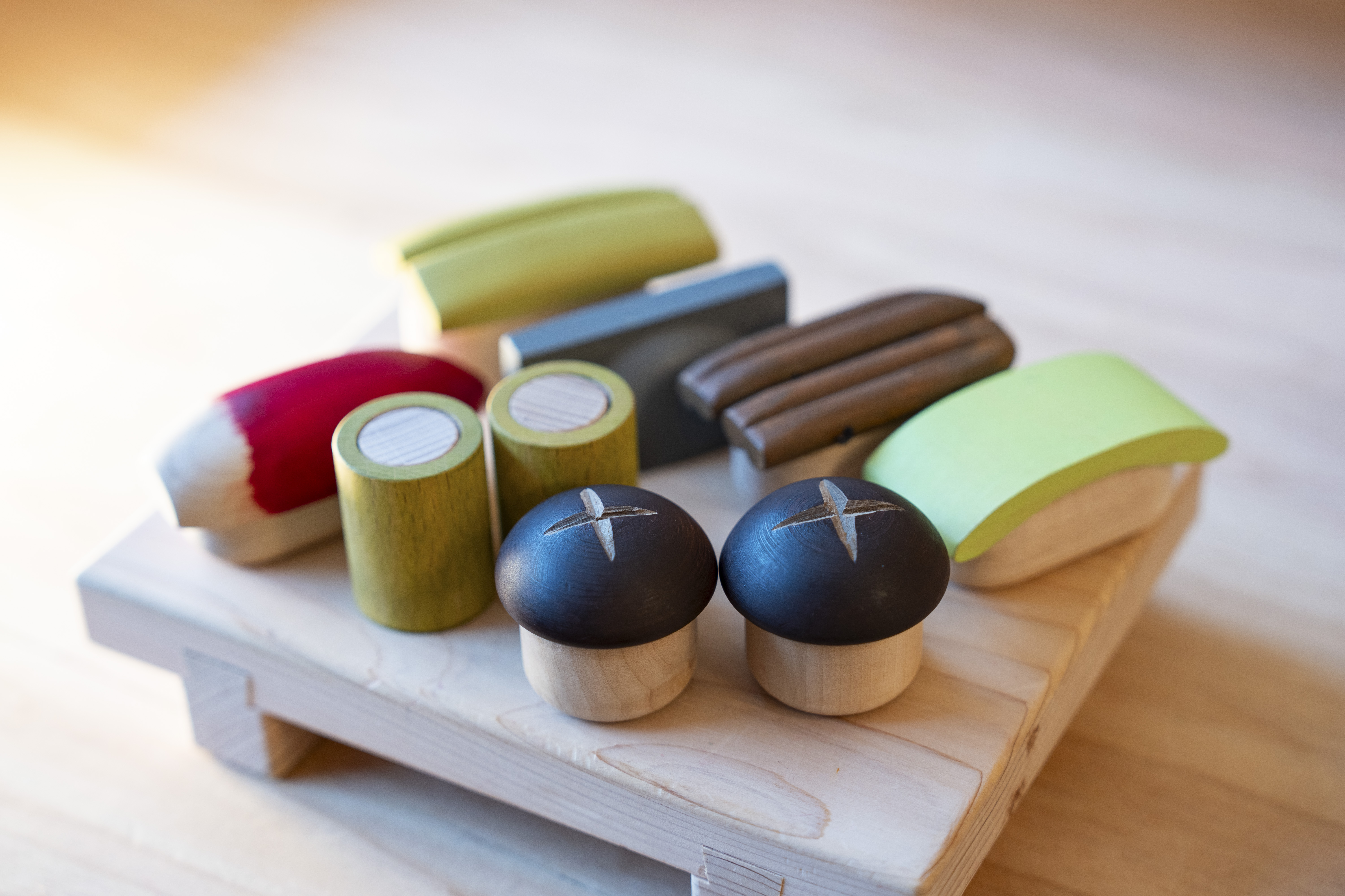 地質学発祥の地のひとつとされ、アンモナイトなどの化石の宝庫としても有名な佐川町。木のたまごプールから、化石や岩石を模した木製ブロックを発掘するあそびや、オリジナルの恐竜が作れる木製のマグネットブロックで遊べます。佐川町名産を集めた「さかわマルシェ」では、ナシやイチゴ、ショウガの収穫あそび、山菜をネタにした郷土料理「田舎ずし」を再現した木のおもちゃで遊びながら、伝統食に親しみ地域の魅力を再発見できます。